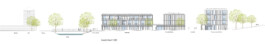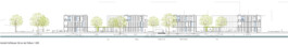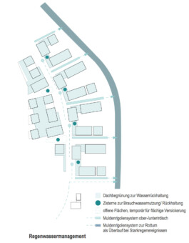 Die vorhandenen Grünstrukturen im Osten und Westen werden in das Areal hinein erweitert und bieten Raum für eine großzügige Durchgrünung und die notwendigen Flächen für Versickerung/ Verdunstung. Der zentrale Erschließungsraum ist die „Adresse“ des Quartiers, ein langgezogener Platzraum, rhythmisiert durch vorspringende Gebäude und Solitärbäume, mit einheitlichem Belag.