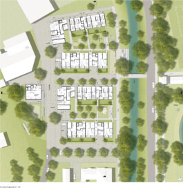 Die Gebäudelängen und die Geschossigkeit orientieren sich am südlichen Bestand an der Spitalmühle und greifen diese auf. Das neue Quartier hat keine Rückseiten und bindet die Umgebung allseitig mit ein.