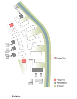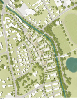 Die (Re-)Integration des Fabrikgeländes in das stadträumliche Gefüge eröffnet neue Perspektiven. Auschlaggebende Entwurfsgedanken sind einerseits die sensible Einbindung und Vernetzung des Quartiers in die Umgebung und andererseits der sparsame Umgang mit Grund und Boden und damit eine zeitgemäße Dichte mit gleichzeitig hoher Wohn- und Lebensqualität.