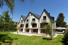 Der Neubau ähnelt auf diese Weise straßenseitig der vorherigen Bebauungsstruktur der zwei Einzelhäuser. Das mehrfach geneigte Dach fasst jedoch mit seinen Faltungen alle Gebäudeteile zusammen und betont so die Einheit als ein Gebäude. Neben den beiden Eckhäusern mit je einer Wohneinheit beherbergt der Mittelteil zwei weitere Wohneinheiten. Die Fassade öffnet sich im Südwesten mit großen Fenstern und Balkonen zur Gartenseite.