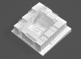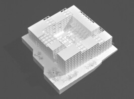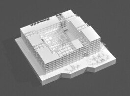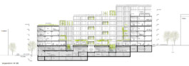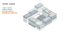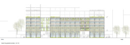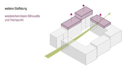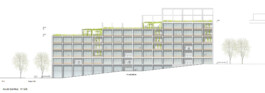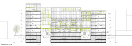Die Volumina zusammenfassendes, Ordnung gebendes Element ist ein großformatiges Rahmenwerk, das sich über die gesamten Fassadenflächen zieht und seine Fortsetzung in großen Pergolastrukturen auf den Dachterrassen und im Innenhof findet. Es verleiht dem Gebäude zugleich eine industrielle als auch offene Anmutung und dient darüber hinaus dazu, die Bauabschnitte mit dreidimensionalen, „hängenden Gärten“ attraktiv zusammenzubinden. Die begrünten Pergolen dienen der Verbesserung des Stadtklimas.