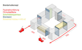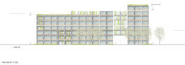 Die Fassade wird als Bandfassade mit außenliegendem Sonnenschutz realisiert. Durch dieses bewährte System können die jeweiligen Fassadenbereiche sehr kostengünstig und individuell auf Sonneneinstrahlung und Wärmeschutz ausgelegt werden. Die Fenster sind manuell zu öffnen und werden zur aktiven Raumlüftung herangezogen. Jedes Fassadenelement wird in Holzrahmenbauweise komplett im Werk vorgefertigt und auf der Baustelle in den Holzskelettbau eingehoben.