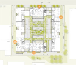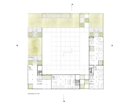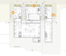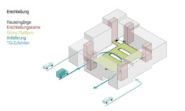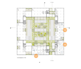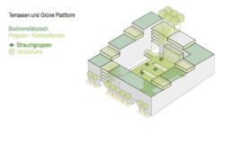 Herzstück der Anlage ist die über der Produktions- und Laborzone angeordnete große ‚Grüne Plattform‘, an die alle Treppenkerne angeschlossen sind und die insbesondere an warmen Tagen zur Mittagszeit zum lebendigen Marktplatz wird. Die ebenfalls auf diesem Niveau angeordnete Mitarbeiter-Kantine mit Außengastronomie wird zugleich Pausentreff und Geheimtipp für die umgebenden Gewerbebetriebe und Firmen.