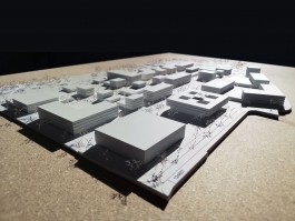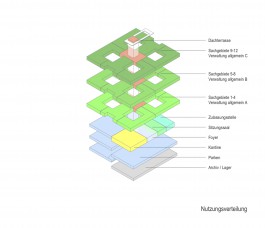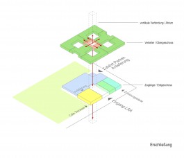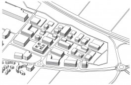 Die Bebauung ist kompakt organisiert, im Sinne eines ressourcenschonenden Umgangs mit Grund und Boden. Die Baukörperstruktur ist additiv. Zur Haupterschließung hin werden Verkaufs-, Sozial- und Verwaltungsräume platziert. Diese Bereiche weisen III - IV Vollgeschosse auf. In der rückwärtigen Zone der jeweiligen Parzelle werden Flächen für Lager, Produktion und Anlieferung vorgesehen, die eingeschossig und mit Gründächern ausgebildet sind.