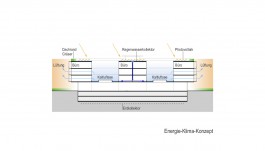 Das Flachdach wird vollflächig für Photovoltaik genutzt und dient gleichzeitig als Regenwasserkollektor. Das gesammelte Wasser wird in die vier Innenhöfe geleitet und bildet dort Kaltluftseen, die das Gebäude von innen kühlen und eine natürliche Querlüftung ermöglichen. Das technische geprägte Kollektordach wird optisch ansprechend in einen intensiv begrünten Dachrand gefasst. Entsprechend wird auch die Fassade durch die Begrünung der diagonalen Rankseile gestaltet. Die Fassadenbegrünung und die auskragenden Geschossdecken bieten zusammen einen angenehmen, wirksamen Sonnenschutz. Als Pendant zum Kollektordach wird unter der Bodenplatte ein Erdkollektor als weitere Energiequelle vorgesehen.