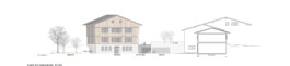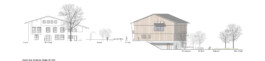 Im Bereich der Büros bilden außenliegende vertikale Holzlamellen einen wirksamen Sonnen- und Sichtschutz, der darüber hinaus für die Räume am Dorfplatz eine geschützte Arbeitsatmosphäre erzeugt.