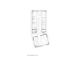 Der Knick in der Kubatur mit den Foyers und dem Treppenhaus gliedert das Gebäude in den südlichen Kopfbau und das nördliche Langhaus. Der Kopfbau beherbergt u.a. den Sitzungssaal. Das administrative Langhaus ist als Dreibund organisiert, die Mittelzone wird über Atrien und Oberlichter belichtet und belüftet.