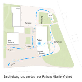 Das Ensemble bestehend aus altem und neuem Rathaus bildet ein einladendes und kompaktes Bürgerzentrum inmitten der großzügigen Grünanlagen des Kurparks und des Bürgerparks. Der Neubau des Rathauses orientiert sich städtebaulich am bestehenden Rathaus, sodass der zentrale Dorfplatz zwischen den beiden Gebäuden räumlich klar gefasst wird. Ein leichter Schwenk des Neubaus nach Südosten öffnet den Dorfplatz weiter in Richtung Kufsteiner Straße und zum Panorama des markanten Wendelsteinmassivs.