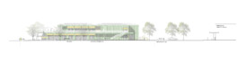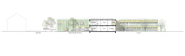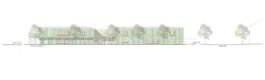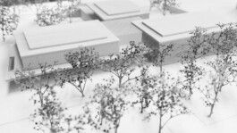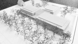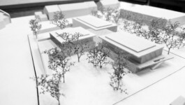 Das neue Kinderhaus mit Schulmensa formuliert als Gegenüber der Grundschule den westlichen Auftakt zum Campus-Gelände. Mit Orientierung an der Gebäudehöhe und Flachdach der Schule schreibt der Neubau die städtebauliche Entwicklung weiter. Gegliedert in drei Baukörper und verbunden durch ein gemeinsames Atrium nimmt der Neubau die Erschließungsachse der Schule mit einem Vorplatz auf. Unter dem einladenden Vordach ist hier der Haupteingang angeordnet. Dieser großzügige Bereich lädt zur Kommunikation und Austausch beim Kommen und Gehen ein. Die Eltern ratschen und die Kinder spielen auf dem gelben Sitztier, dem „Oktopus“!