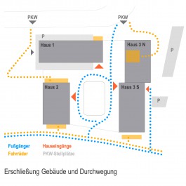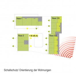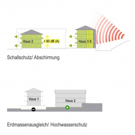 Das Wettbewerbsgebiet ist erheblichen Lärmeinwirkungen insbesondere von der östlich gelegenen Bahnlinie ausgesetzt. Besonders laute Geräusche entstehen im Süden beim Befahren der Loisachbrücke. Der Entwurf sieht den Schallschutz städtebaulich, architektonisch und technisch vor. Die Nord-Süd Orientierung von Haus 3 bildet eine Barriere zur Emissionsquelle Bahn; der höhere Südteil des Hauses schützt zudem vor Lärm-Immission von der Brücke. Die effiziente Erschließung über den witterungsgeschützen Laubengang bildet zusammen mit der Schicht der Nutzräume nach Osten in den Wohnungen eine Zonierung gegen den Lärm.