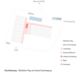 Die Neubebauung des Grundstücks stellt sich in die Tradition der dörflichen Baukultur. Über den Hof im Norden werden das Hauptgebäude und die notwendigen Nebenanlagen. Im Zentrum steht eine Linde als Hofbaum. Überdachte Vorzonen vermitteln zu den privaten Wohnbereichen. Eine umlaufende Balkonzone bietet für jede Wohnung einen geschützten privaten Freibereich. An der zentralen Erschließung ist der Gemeinschaftsraum angeordnet mit Terrasse und Hochbeeten zum gemeinschaftlichen Gärtnern. Direkt angeschlossen ist die etwas tiefer liegende Spielkuhle.