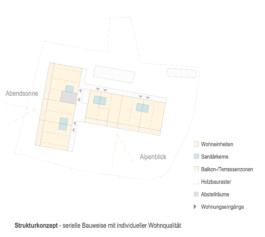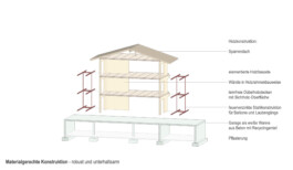 Das Gebäude ist als vorgefertigter Holzbau konzipiert. Lediglich die Laubengänge und Balkone sind davon losgelöst als vorgesetzte feuerverzinkte Stahlkonstruktionen geplant. Dies dient einer wartungsarmen und dauerhaften Ausführung, die die eigentliche Dämmebene der Gebäude nicht durchdringt und somit wärmebrückenanfällige und kostenintensive Details reduziert. Durch großzügige Überstände schützen die Balkone und Laubengänge die dahinterliegenden Holzfassaden vor starker Bewitterung. Zusätzlich bieten sie einen baulichen Sonnenschutz.