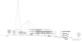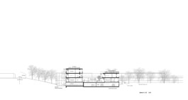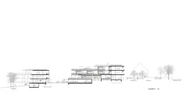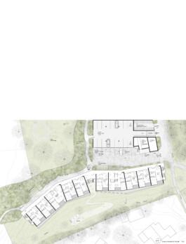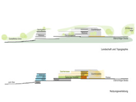 Die Dachbegrünung des Wohnmäanders mit Wildblumen und Wildgräsern bietet nicht nur Versickerungsflächen und klimatischen Ausgleich durch Verdunstung im Sommer, sondern auch die landschaftliche Anbindung und Aufsicht parallel zur Staffelung des Terrains im Schnittprofil hinunter zum See.