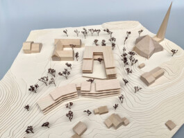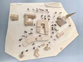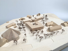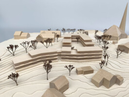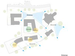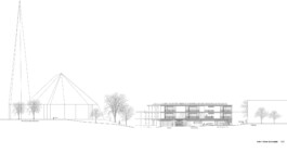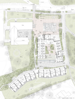 Er spannt sich zwischen Kirche und Pfarrsaal auf und wird im Westen ergänzend vom Neubau gefasst. Durch die Wegeverbindung und Aufwertung nach Osten bindet der Platz auch das zukünftige Wohngebiet Am Teilsrain mit an. Der neue Gebäudemäander beinhaltet auf zwei bzw. drei Geschossen kompakt das Raumprogramm. Die Baukörper sind zum See hin gezielt terrassiert und gliedern sich dadurch in die Landschaft sowie den Baubestand differenziert ein.