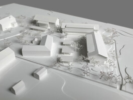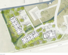 Ein üppiger Natursaum aus blühenden Wiesen und ortspezifischen Bäumen rahmt die Gebäude ein, bestehende Bäume werden ergänzt mit Weiden, Erlen und Obstbäumen.
