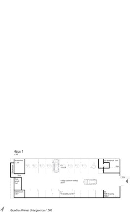 Das Haus 1 – im weniger wassergefährdeten Bereich – erhält eine Unterbauung durch eine natürlich belüftete Garage, um auf diese Weise zusätzliche Versiegelung zu vermeiden.