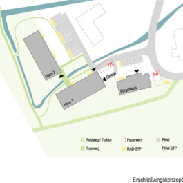 Für die neue Nutzung und Barrierefreiheit wird eine Erschließung mit Aufzug entlang der Nordfassade des Gebäudes geplant. Die erforderliche Vergrößerung des Gebäudes ist in Holzbauweise vorgesehen. Die ehemaligen Laderampen werden als prägnante Elemente erhalten und in Terrassen umgewandelt.