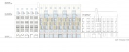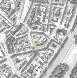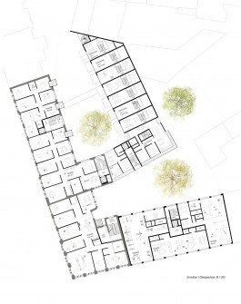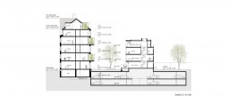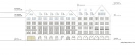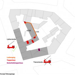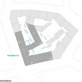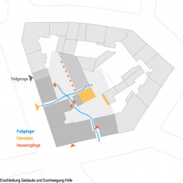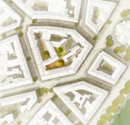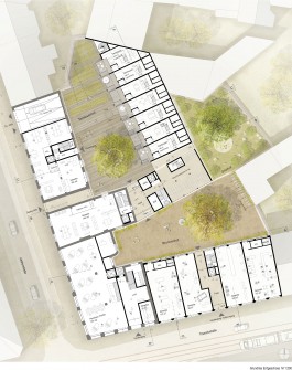 Die vorgeschlagene Straßenbegleitende Bebauung zeichnet sich durch eine behutsame Herausarbeitung der historischen Qualitäten der denkmalgeschützten Blockrandbebauung aus, ohne diese zwingend in allen Teilen auf den Originalzustand zurückführen zu müssen. Mit Rücksicht auf die eher beengten Grundstücksverhältnisse im Blockinnenbereich folgt die Innenhofbebauung im Wesentlichen dem Fußabdruck der Bestandbebauung, auch um die Möglichkeit bestehender Grenzbebauungen ausschöpfen zu können. Die durch die gewählte Gebäudekonfiguration im Blockinnenbereich entstehenden drei Hofräume – der ‚Terrassenhof‘, der ‚Grünhof‘ und der ‚Brunnenhof‘ – werden ein wichtiges Gestaltungs- und Vermarktungskriterium des Quartiers.