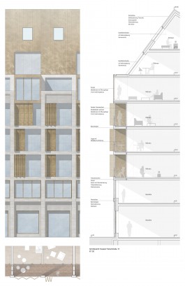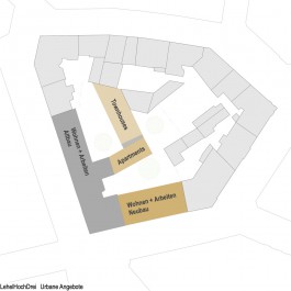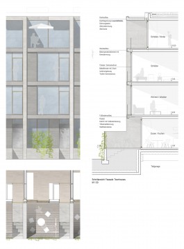 Unser Entwurf bietet drei Wohnformen an: Etagenwohnungen,"Familienwohnungen" (Wohnen und Arbeiten) und Townhouses. Die straßenbegleitenden Gebäude enthalten gewerbliche Nutzungen in den ersten zwei Geschossen. Die darüber angeordneten Wohngeschosse sind deshalb auch in den Innenhöfen sehr gut zu belichten und somit für Etagenwohnen bestens geeignet. Die vorgeschlagene Typologie der Townhouses als Hofbebauung hat zwei wesentliche Vorteile: Jede Einheit nutzt die volle Gebäudehöhe, wodurch es keine schlecht belichtetenWohnungen gibt. Durch die Möglichkeit einer durchgehenden Belichtung im Bereich der Erschließungstreppe durch Oberlichter kann im Bereich der Grenzbebauung eine unbefensterte Brandwand zum Nachbargrundstück ausgebildet werden, ohne die Wohnqualität wesentlich einzuschränken.
